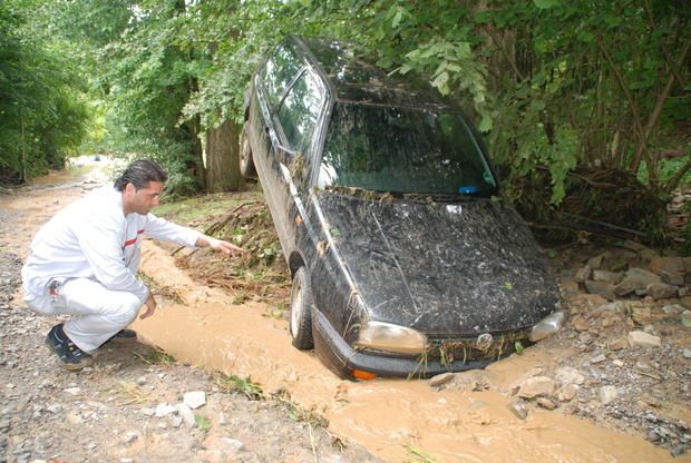 Hagelunwetter 2008: In Neuenstadt-Stein, beim Steinbruch, wird ein Auto von den Wassermassen mitgerissen und an einen Baum gedrückt.
