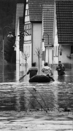 Hochwasser 1993. Offenau ist nur per Schlauchboot passierbar. Foto: HSt-Archiv