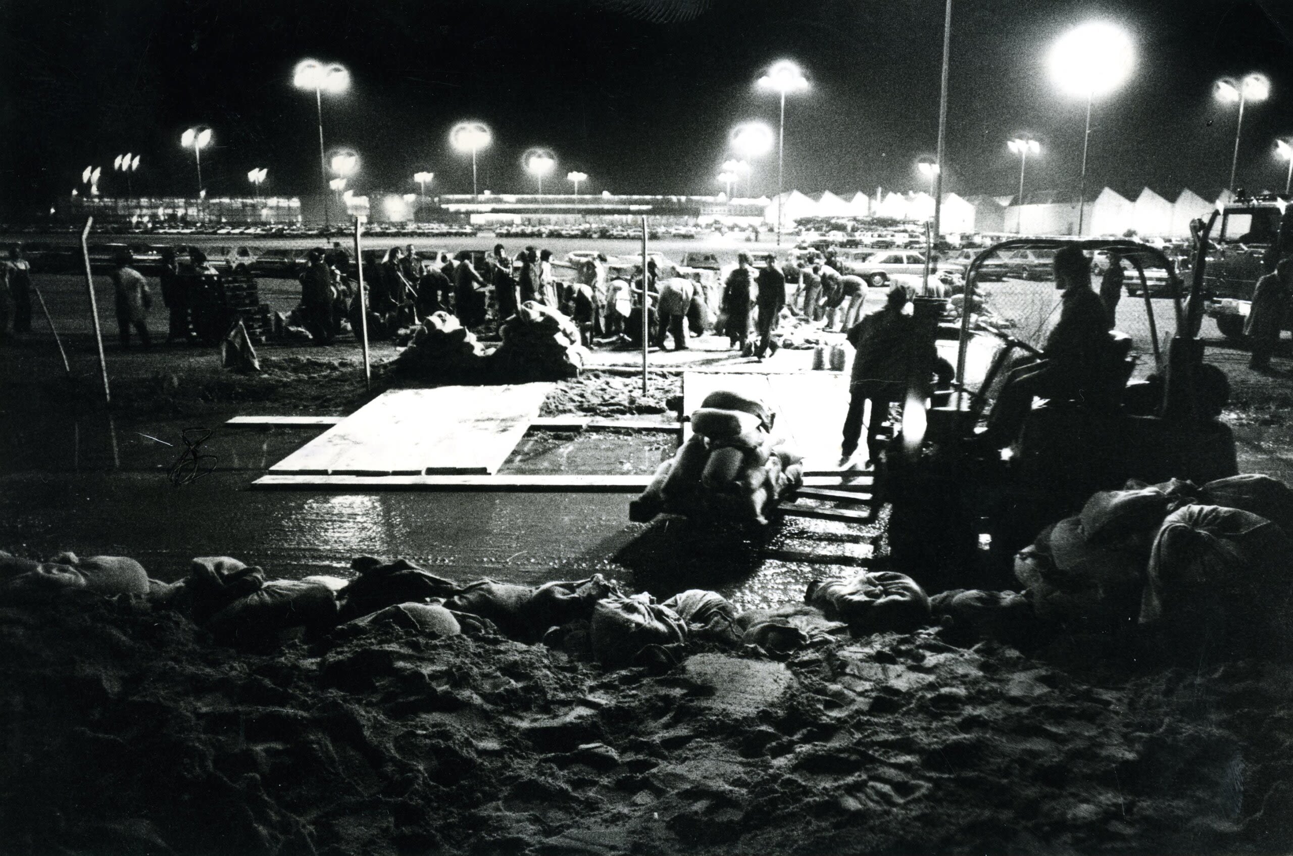 1978: In der Nacht von 24. auf den 25. Mai versuchen Helfer auf dem NSU-Gelände den Damm zu retten. Dank der Anfang der 70er Jahre gebauten Sulmdole kann das Hochwasser im Zaum gehalten werden. Foto: HSt-Archiv