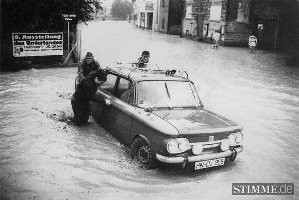 Mai 1978: Helfer schieben den im schlammigen Wasser stehen gebliebenen Pkw. Foto: HSt-Archiv